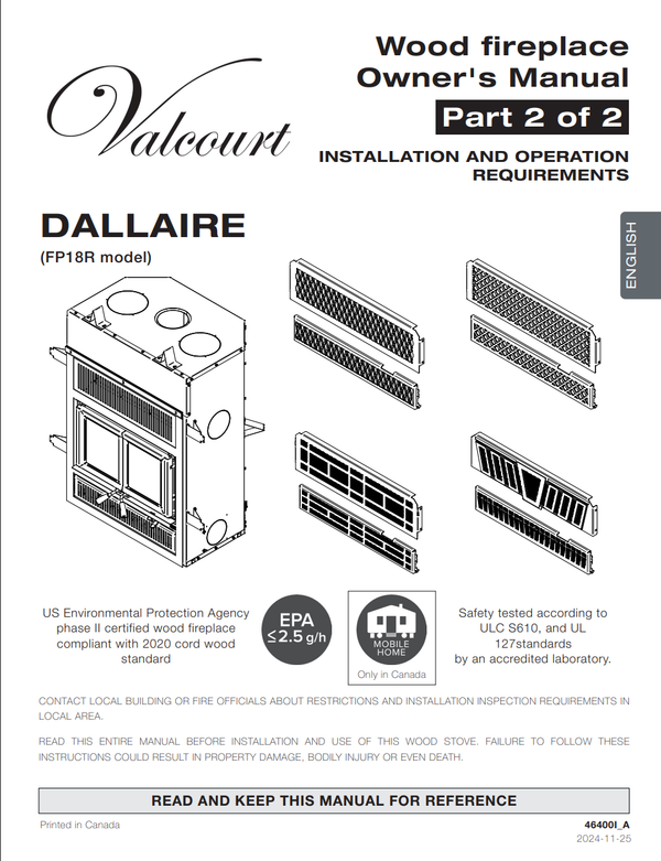Versatile and designed to meet your needs, the Dallaire II efficiently heats spaces up to 2,500 square feet while creating a cozy and warm ambiance. With its doors closed, it ensures efficient, long-lasting combustion. With the doors open, paired with the optional firescreen (AC01226), it provides the authentic charm of a wood fire, safely. A perfect complement to Valcourt’s high-efficiency fireplace lineup, the Dallaire II offers five louvre styles to personalize the faceplate of your appliance.