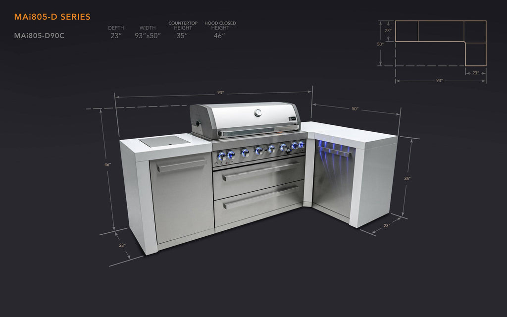 The Mont Alpi D series stands for deluxe and that is exactly what you get from the MAI805-D90C. This grill combines six burners of standard cooking size along with an extremely useful infrared side burner suitable for searing, pan frying and boiling and an infrared rear burner for the ultimate rotisserie experience. The 90 degree corner module is the perfect fit for right angles and tighter spaces and adds useful extra prep area. The Mont Alpi D series comes with waterfall granite which extends down the sides of the grill for easy cleaning and extra class, the unit also includes a heavy duty rotisserie kit, full size weather cover and a granite matching chopping board. The grill comes standard with LED knob lights that are blue when off and red when on and bright internal cooking lights for perfect vision and precision control. Be sure to check out the useful optional accessories such as the charcoal tray and griddle. Grill comes as propane ready but can be converted to Nat gas within minutes, simply buy the additional Mont Alpi Natural gas conversion kit.