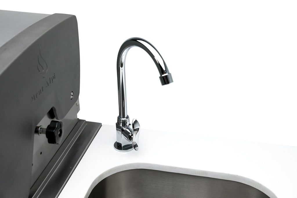 The Mont Alpi D series stands for deluxe and that is exactly what you get from the MAI805-D90FC. This grill combines six burners of standard cooking size along with an extremely useful infrared side burner suitable for searing, pan frying and boiling and an infrared rear burner for the ultimate rotisserie experience. The 90 degree fridge module is the perfect fit for right angles and tighter spaces and adds a beautiful outdoor rated refrigerator, fit for any party animal. The Mont Alpi D series comes with waterfall granite which extends down the sides of the grill for easy cleaning and extra class, the unit also includes a heavy duty rotisserie kit, full size weather cover and a granite matching chopping board. The grill comes standard with LED knob lights that are blue when off and red when on and bright internal cooking lights for perfect vision and precision control. Be sure to check out the useful optional accessories such as the charcoal tray and griddle. Grill comes as propane ready but can be converted to Nat gas within minutes, simply buy the additional Mont Alpi Natural gas conversion kit.