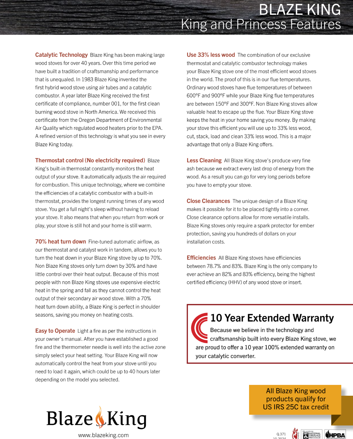 As the Environmental Protection Agency (EPA) Clean Air Act continues to evolve, we’ve committed ourselves to leading the industry in developing pollution-reducing hearth appliances. All Blaze King stoves generate minimal pollutants and not only meet, but far exceed the EPA’s emission requirements.